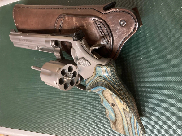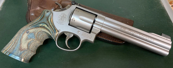 Der Revolver hat einen seltenen, dezent blau gemaserten Nill-Griff und wird mit wertigem Lederholster verkauft. Spezifikationen siehe: ../../www.frankonia.de/p/smith-wesson/revolver-modell-686-target-champion/181016?query=Smith+%26+Wesson+